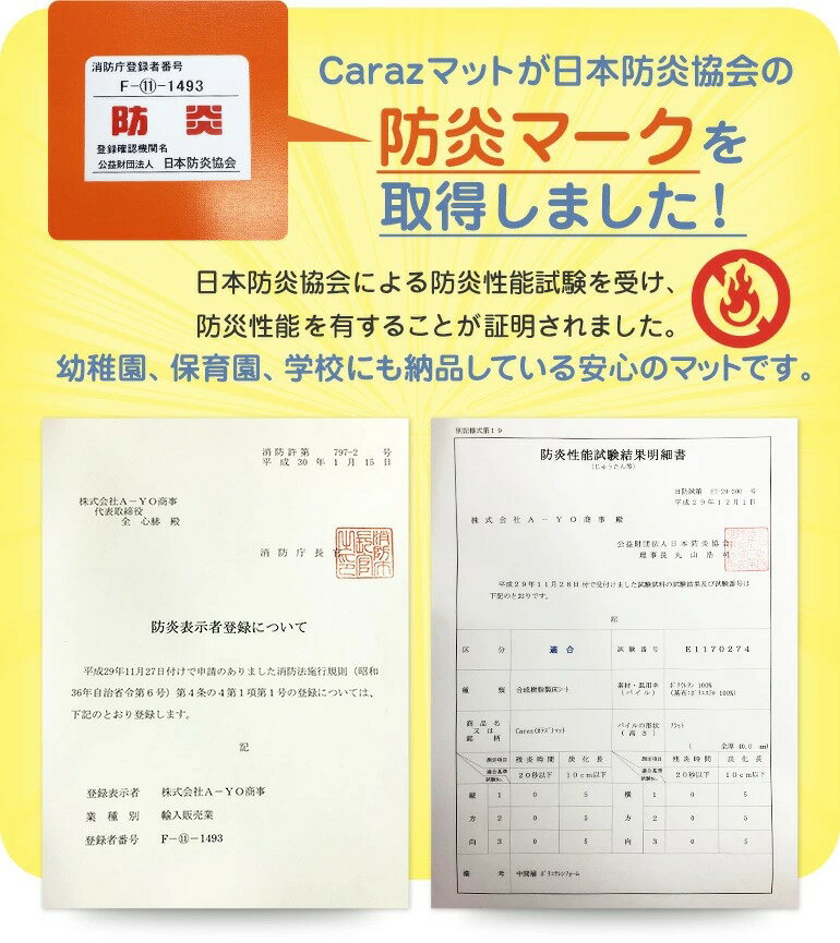 安全性 ISO9001認証、ISO14001認証、IC認証、ヨーロッパのCE認証、韓国騒音・振動認証、 アメリカCPSIA認証、韓国のKC認証、ロシア国家標準認証、Well-being認証など様々な安全 テストを通過! 防音性 騒音振動認証、65dB⇒30dB! 子供がジャンプしても層間騒音防止に抜群! マンション階下の防音対策に最高なマット! 特徴 ・熱接着で、新環境・無毒性製品 ・折り畳み式なので、収納・保管も簡単 ・軽量で持ち運び・移動も楽々 ・優れたクッション性で安心・安全 ・4cmの厚さで優れた防音性・弾力 ・生活防水でお手入れ・掃除も楽々 ・ベビーフェンス、ガード兼保護マット ・カラフルなカラーでおしゃれなインテリア ・使って見るとジョイントマットはもう使えません。