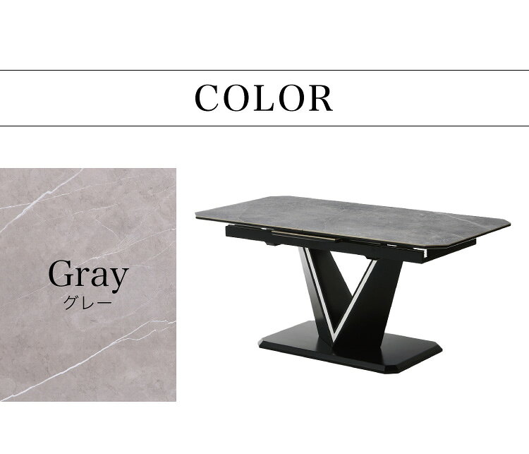 ■商品サイズテーブル:幅160〜200cm×奥行85cm×高さ72cmチェア幅46cm×奥行59cm×高さ98cm(座面高44)cm■素材[テーブル]天板:鏡面セラミック石目脚部:MDFウレタン塗装[チェア]張地:PU中身:ウレタン脚部:アイアンメッキ仕上げ ■生産国中国製■特徴テーブルは人数やお部屋に合わせ160cmまたは200cmで使用可能な伸長テーブル。