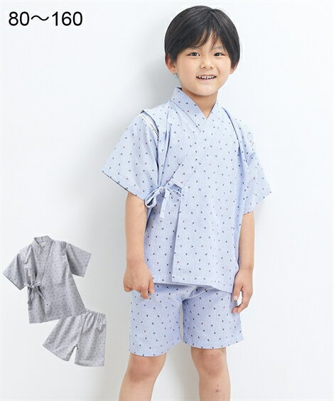 アウトレット★【送料無料】甚平 じんべい 浴衣 ゆかた しじら織 しじら ストライプ 甚平 浴衣 ベビー 男の子 男児 キッズ プリント 和柄 和風 祭り 綿100% 上下セット セットアップ ネイビー/ストライプ 80cm/90