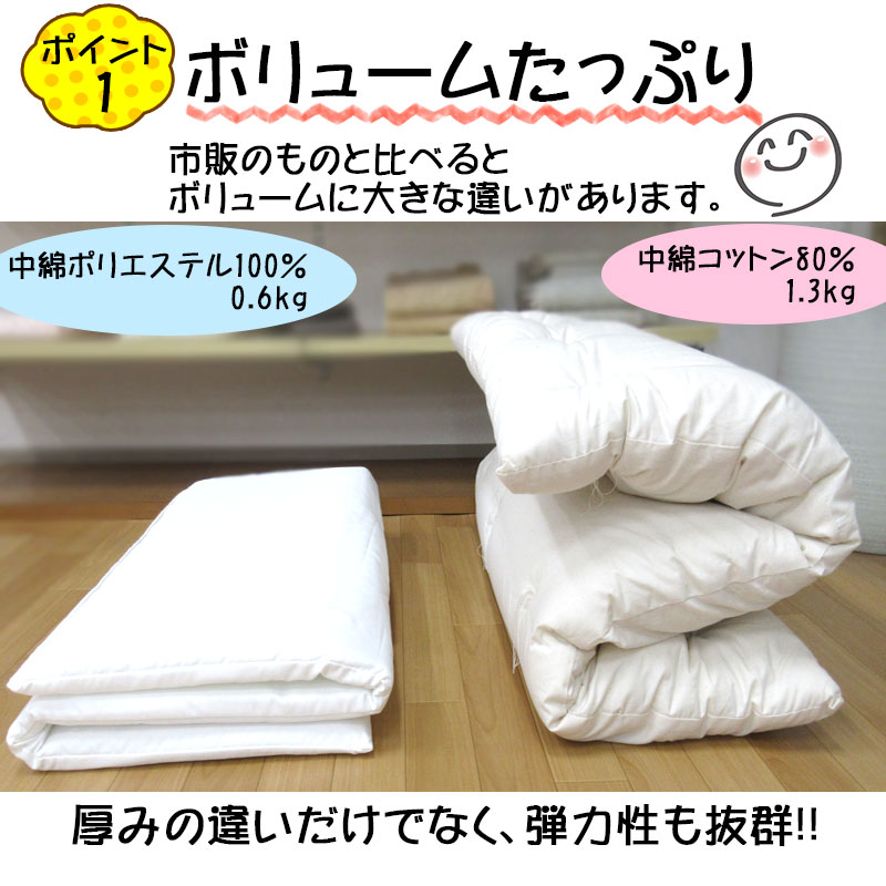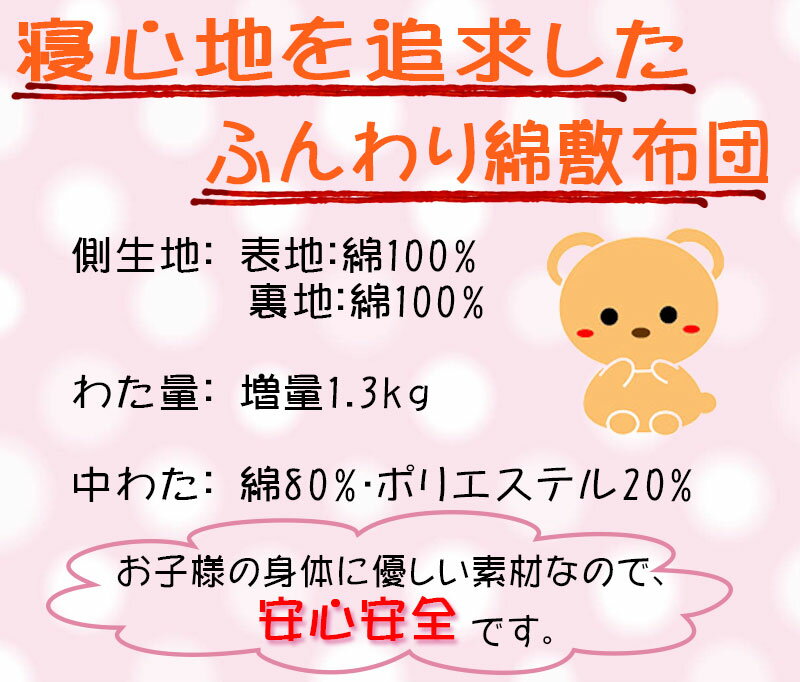 【北海道・沖縄配送不可商品】 ◆商品番号:kd-wata お昼寝 ●日本製 ●素材:側生地:表地:綿100% :裏地:綿100% 中わた 綿/約80% ポリエステル/約20% 詰めもの重量 増量1.3kg ●側生地サイズ:約70×120cm ※まれに黒いものが入っているのが見えることがありますが、天然の綿のわたに混ざっているもので、 ゴミ等ではございませんのでご安心ください。