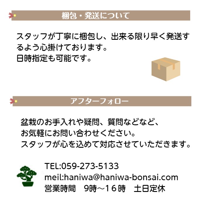 店舗説明創業 平成31年1月 長年地域の皆様に愛されていた“山野草・園芸用品販売ハニワ陶苑”のお店を引き継ぎ、盆栽に特化した盆栽専門店に!全国から集めた1万点以上の商品を取り揃えております。