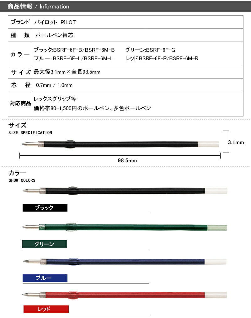 パイロット PILOT ボールペン替芯 0.7mm / 1.0mm ブラック BSRF-6F-B・BSRF-6M-B / グリーン BSRF-6F-G / ブルーBSRF-6F-L・BSRF-6M-L / レッド BSRF-6F-R・BSRF-6M-R 油性ボールペン替芯 油性ボールペン芯 80-1500円用