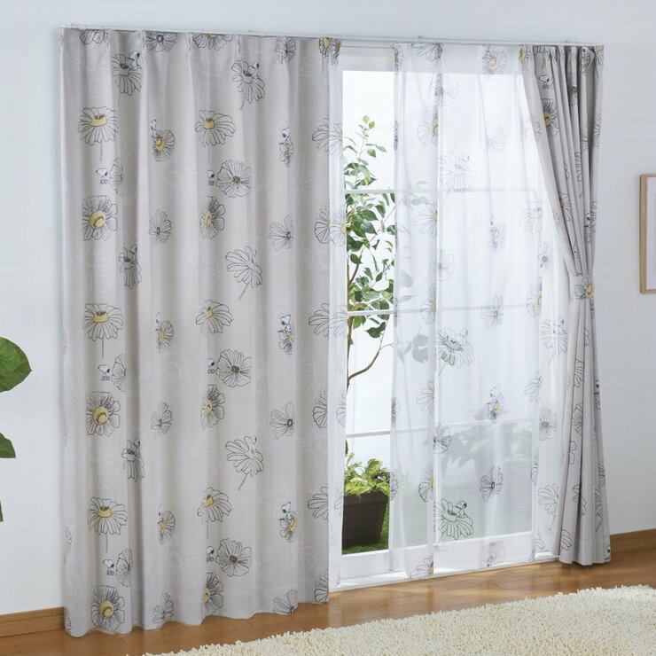 スヌーピー 2級遮光カーテン箔プリントフラワーリーフスヌーピー&ウッドストック スヌーピー レースカーテン箔プリントフラワーリーフスヌーピー&ウッドストック