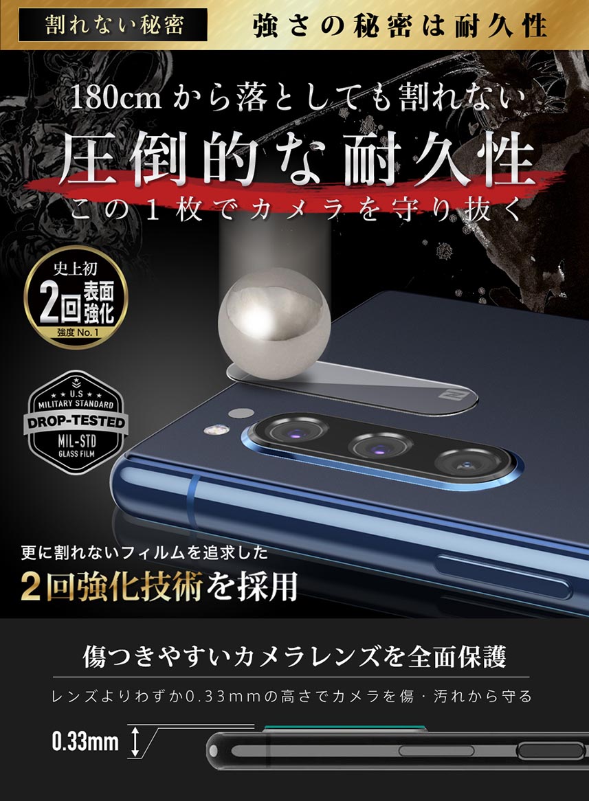 【 10H カメラガラスフィルム 〜 高さ1mから落ちても割れにくい 】 ● 従来品とは一線を画した “ 高品質ガラスフィルム ” が カメラを守ります。