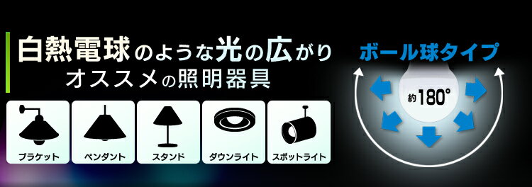 白熱電球のように光が広がる、広配光タイプのLEDボール電球です。