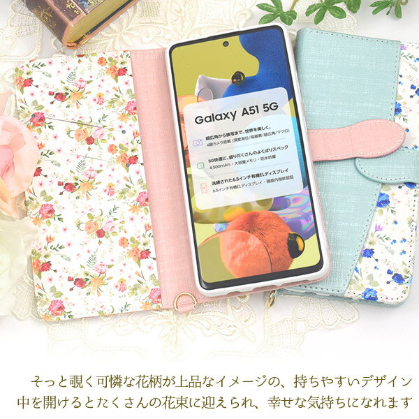 小花柄【Galaxy A51 5G SC-54A/SCG07用(5G対応)手帳型ケース フラワー ユリ 薔薇 バラ 上品 ブルー ピンク ストラップ 5g サムスン sc-54a 手帳型ケース 手帳 galaxy scg07 ケース au ギャラクシーa51 かわいい プレゼント 母 プレゼント【送料無料】[M便 1/3]