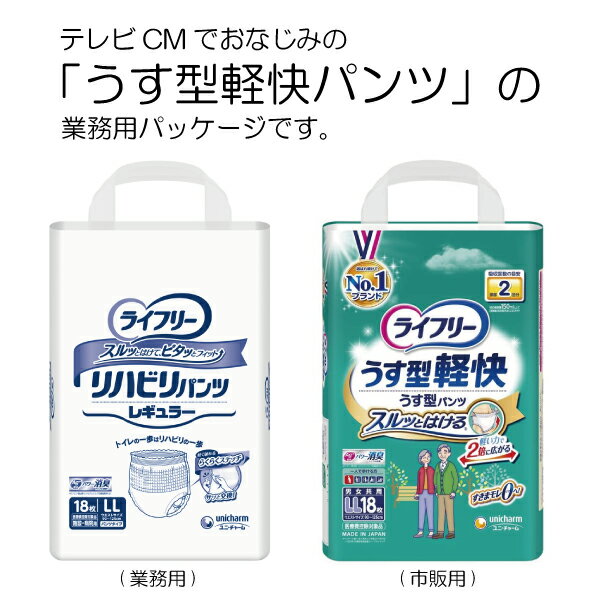 テレビCMでおなじみ「うす型軽快パンツ」の業務用パッケージです トイレの一歩はリハビリの一歩 スルッとはけて、ピタッとフィット ・Ag+ パワー消臭 ・軽く破れるらくらくステッチ ----------------------------------- ・おむつの種類:パンツタイプ ・適合ウエスト寸法:90cm〜125cm LLサイズ ・尿吸収量:おしっこ約2回分 ・1枚あたりの単価:83.2円 ・袋入り数:18枚 ・箱入り数:4袋 ・男女共用 ・医療費控除対象品 ※領収書承ります。