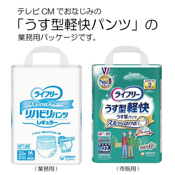 テレビCMでおなじみ「うす型軽快パンツ」の業務用パッケージです トイレの一歩はリハビリの一歩 スルッとはけて、ピタッとフィット ・Ag+ パワー消臭 ・軽く破れるらくらくステッチ ----------------------------------- ・おむつの種類:パンツタイプ ・適合ウエスト寸法:60cm〜85cm Mサイズ ・尿吸収量:おしっこ約2回分 ・1枚あたりの単価:68円 ・袋入り数:22枚 ・箱入り数:4袋 ・男女共用 ・医療費控除対象品 ※領収書承ります。