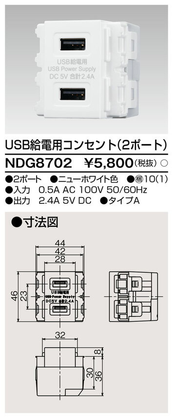 β東芝 電設資材【NDG8702】E’s配線器具 USB給電用コンセント (2ポート) ニューホワイト色