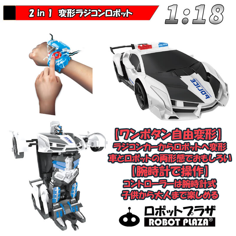 子供 誕生日プレゼント子供 おもちゃ 商品名変形 ラジコン ロボット おもちゃ 腕時計型コントローラー付きデザイン警察車完成品/要組立完成品材質ABS製品サイズ約24x10x7cm製品重量約320 g操作方法腕時計型コントローラー(1つのコントローラーで複数台の同商品を同時に操縦する仕様です)電池本体:単3アルカリ乾電池3本(別売) 腕時計コントローラー電池:ボタン電池(LR44/AG13)X3本(テスト電池付属)パッケージサイズ約19.5*9.5*26.5cmパッケージ重量約430 g内容物本体*1 コントローラー*1 日本語取扱説明書*1別途ご用意いただくものプラスドライバー商品紹介【 ワンボタンで変形 】 ラジコンカーとしてだけでなく遊べる!リモコンの変形ボタンを押すと、ワンクリックで車からロボットへ変形します。