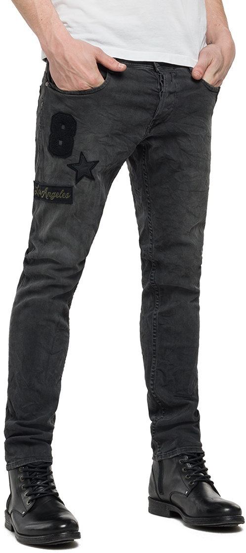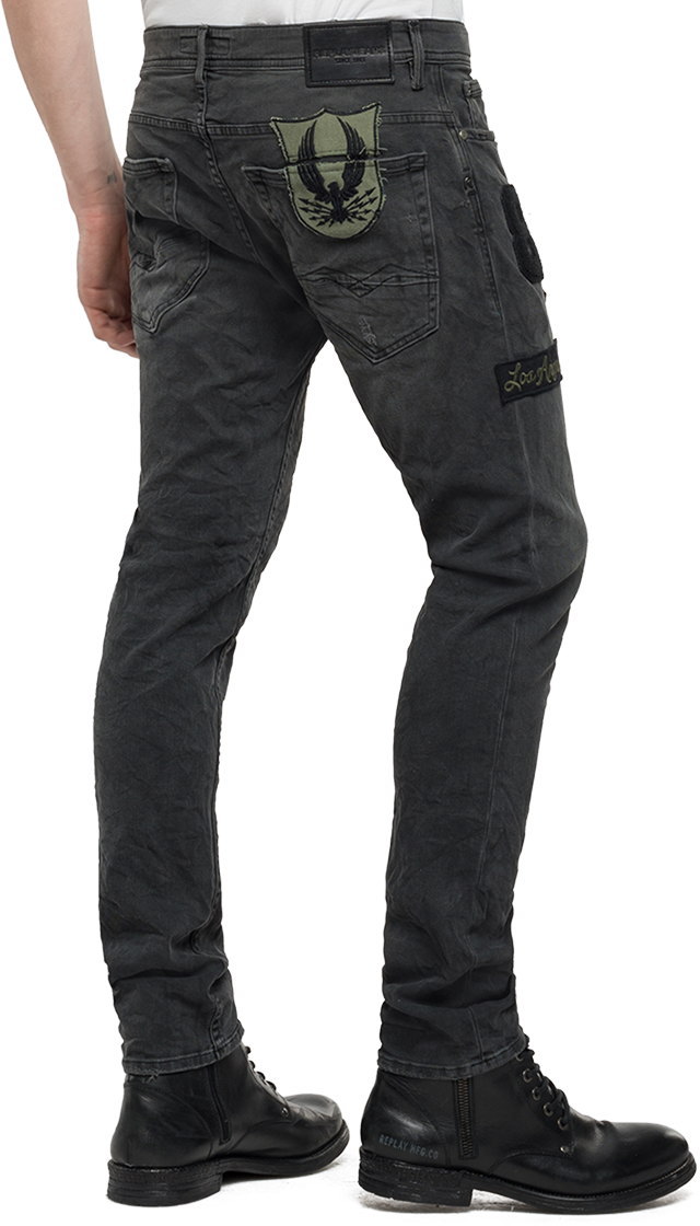 REPLAY/リプレイMA964P“THYBER(サイバー)”SLIM FIT JEANSワッペン付き、スリムフィット・ストレッチ ブラックジーンズ10oz BLACK COATED STRETCH DENIM