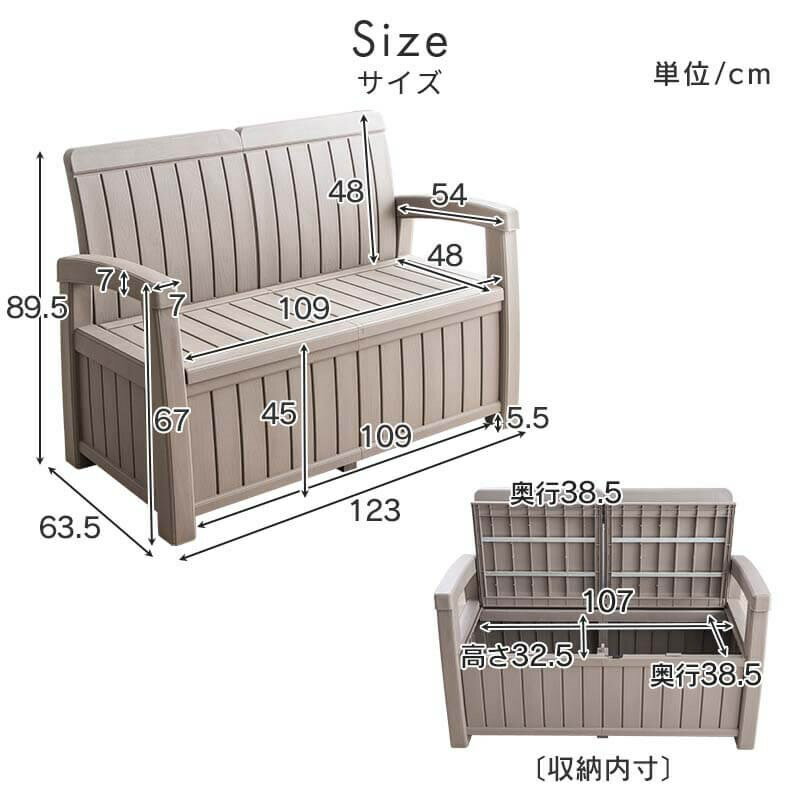 【商品名】収納庫付き ガーデンソファ 2P【サイズ】幅123×奥行63.5×高さ89.5cm座面高:45cm背もたれ高さ:48cm収納内寸サイズ:幅107×奥行き38.5×高さ32.5cm【重量】約15.8kg【梱包サイズ】約74×67××56cm【材質】ポリプロピレン【その他】お客様組立(組立時間目安:大人2人で30分)収納容量2P:184L【代引きについて】こちらの商品は、代引きでの出荷は受け付けておりません。